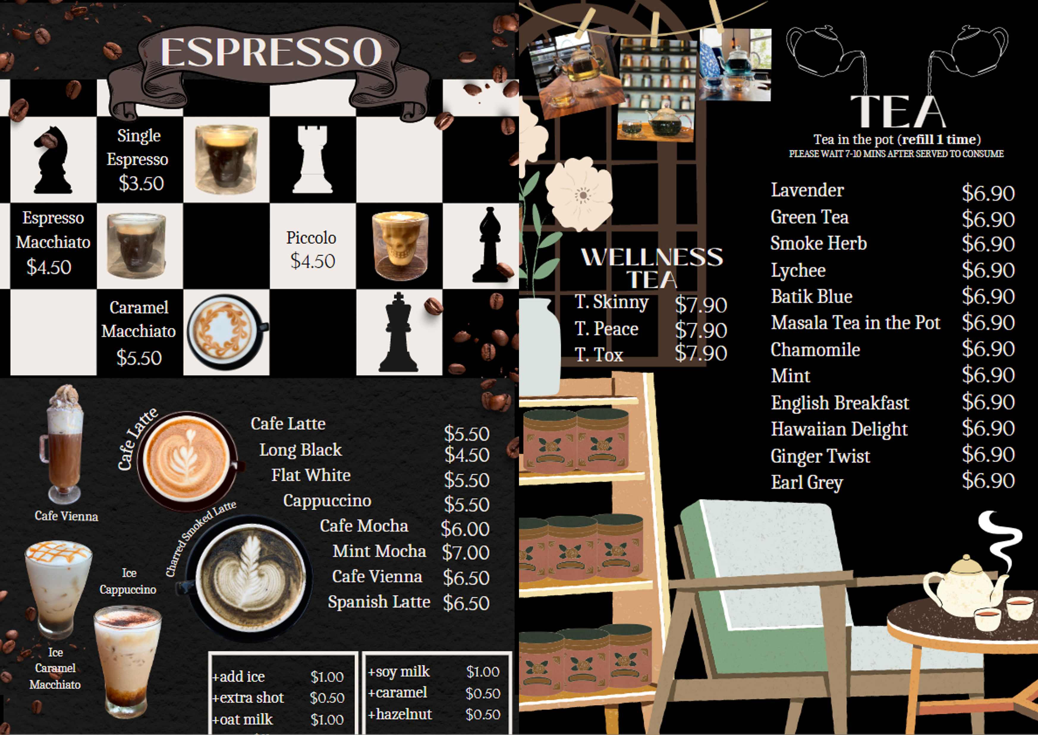 At Addicted to Black cafe, we roast our own coffee beans and curated special blended tea leaves to ensure that our customers will get the highest quality beverage. Try our Smoke herb tea with a slight tinge of burnt after taste. Specialising as a Singapore Lifestyle Specialty Coffee Café — inspired by the founder’s love for reclaimed wood & coffee - music is an imperative element in our Singapore Addicted to Black café.