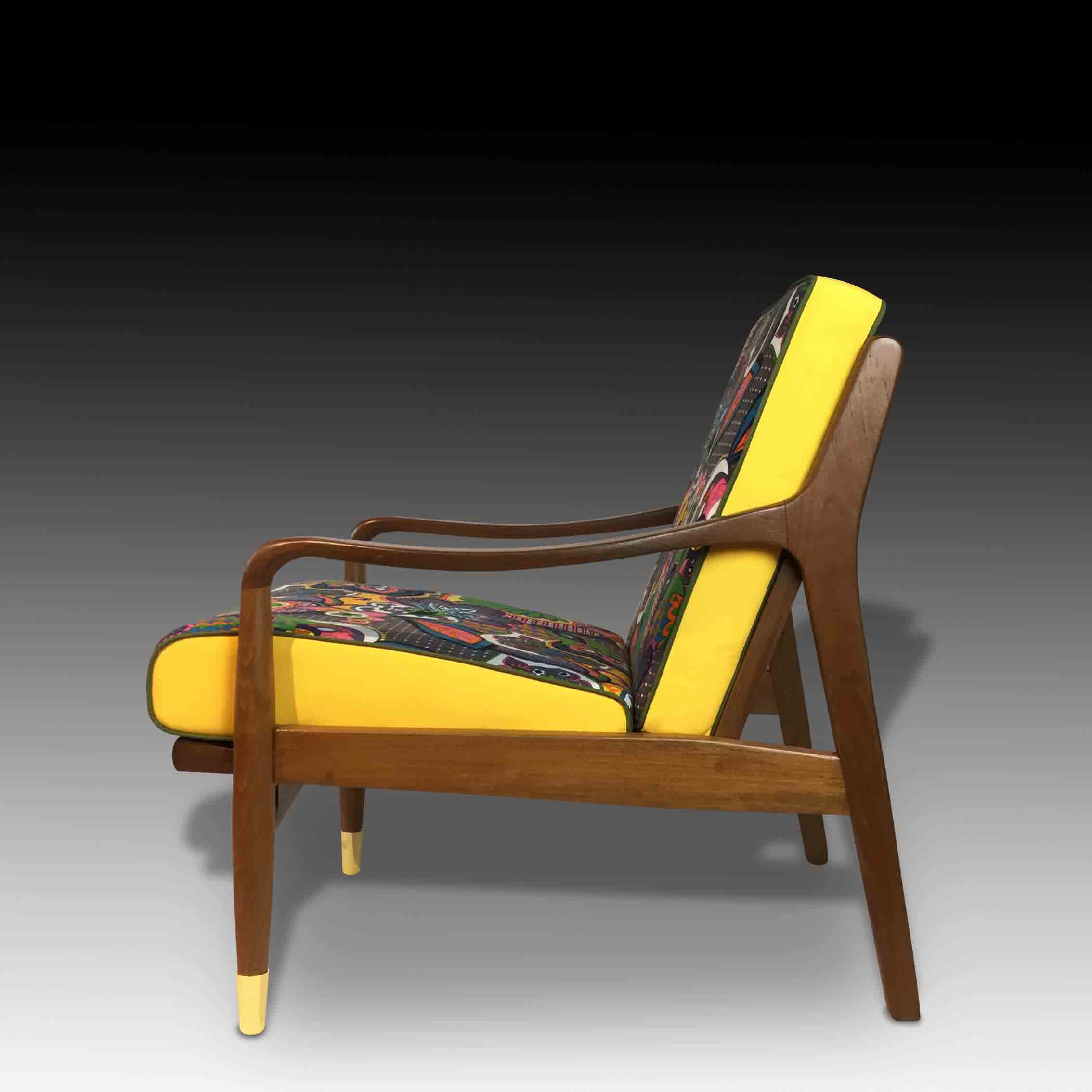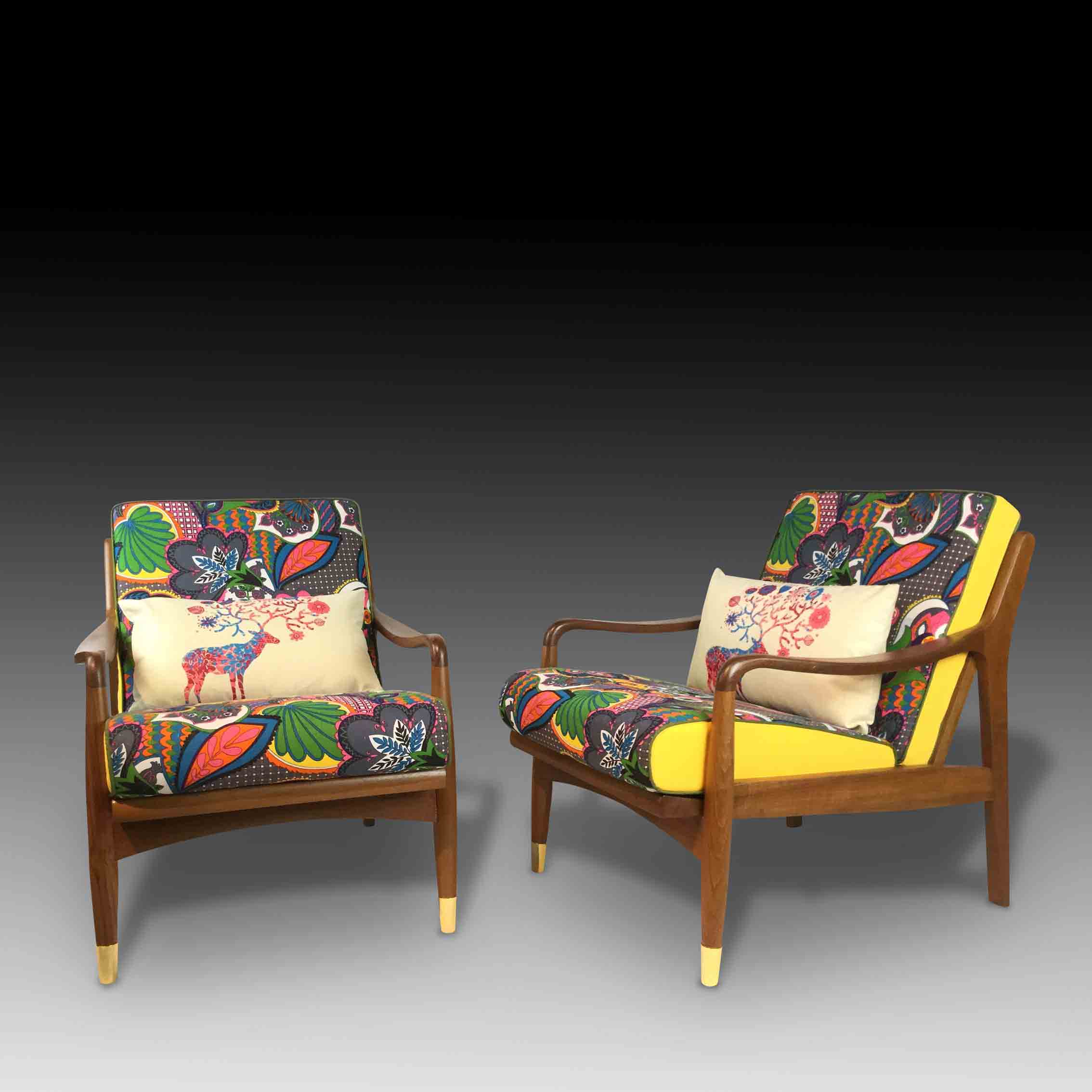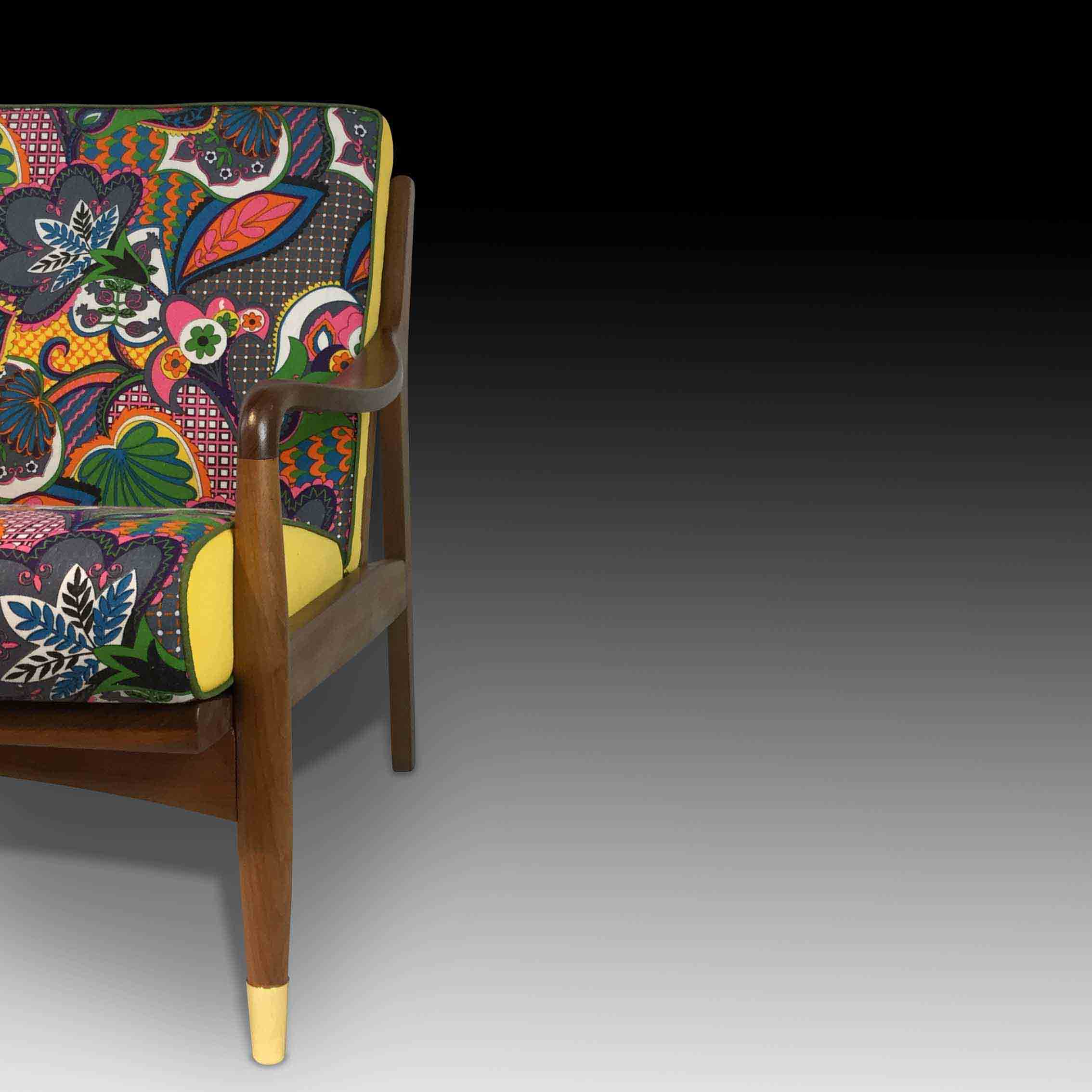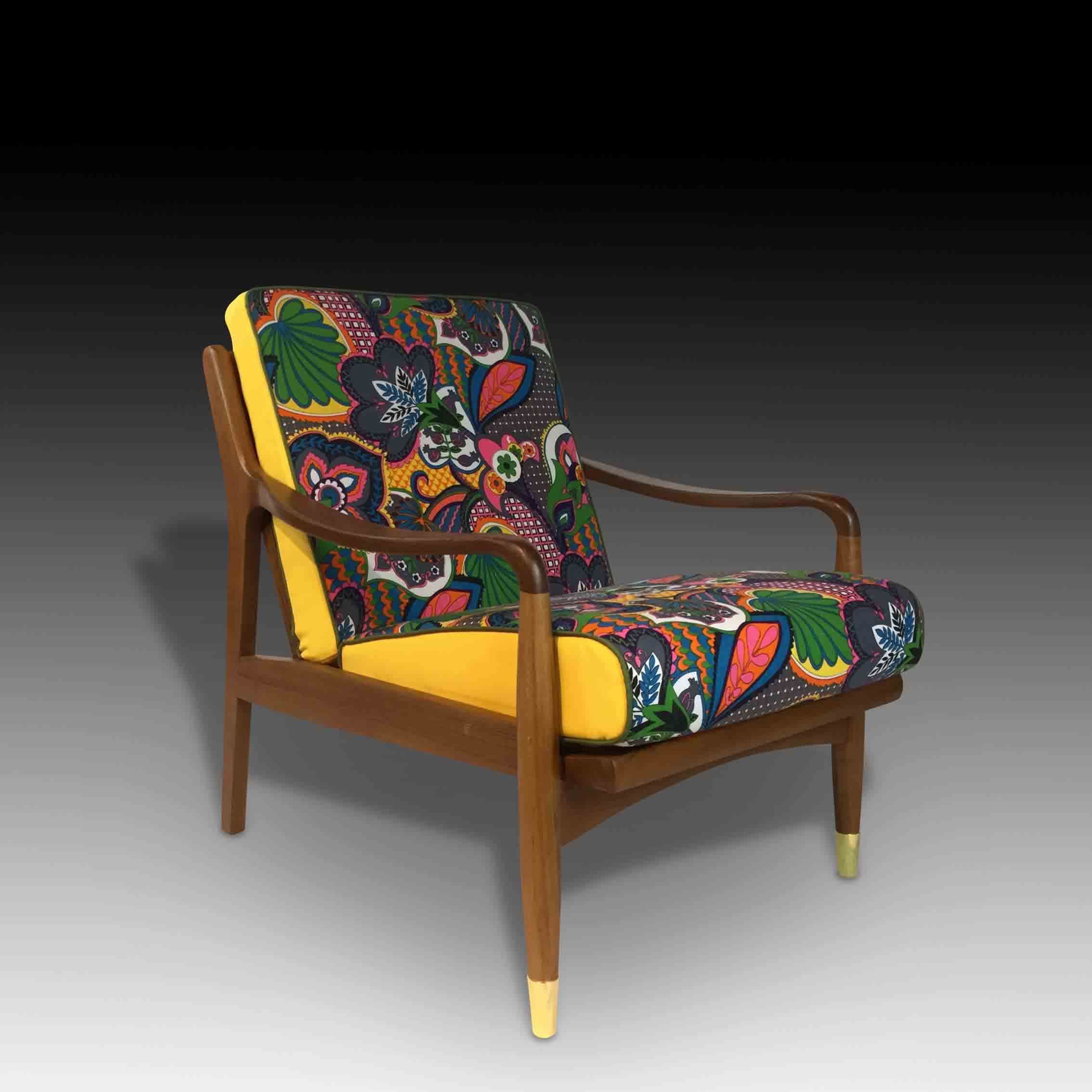 The Batik Armchair is a modern, Southeast Asian take on retro furniture design. Taking the blocky silhouette popular in the 70s, we have combined it with our specially designed retro-style fabric upholstery inspired by the beautiful batik prints in the Southeast Asian region. Combined with the sleek pencil legs with gold capping, the Batik Armchair is a beautiful and charming combination of the traditional and the modern, of Western and Asian styles, to create a unique furniture piece for your home.