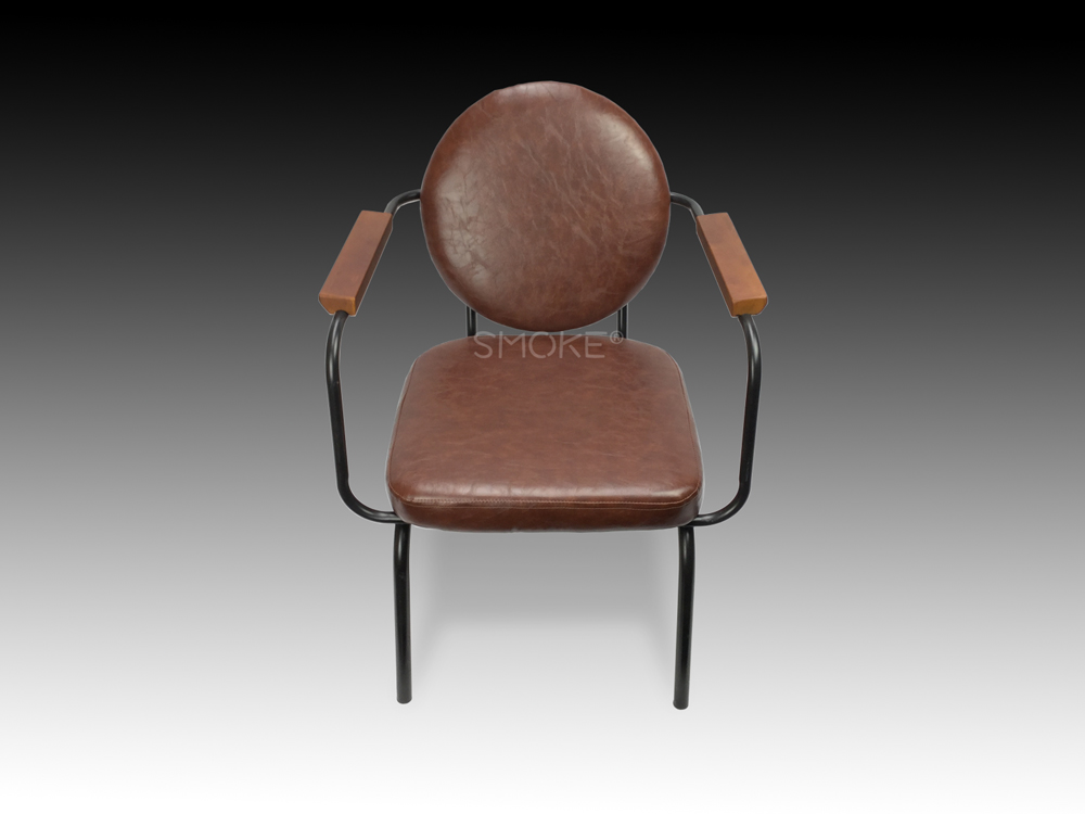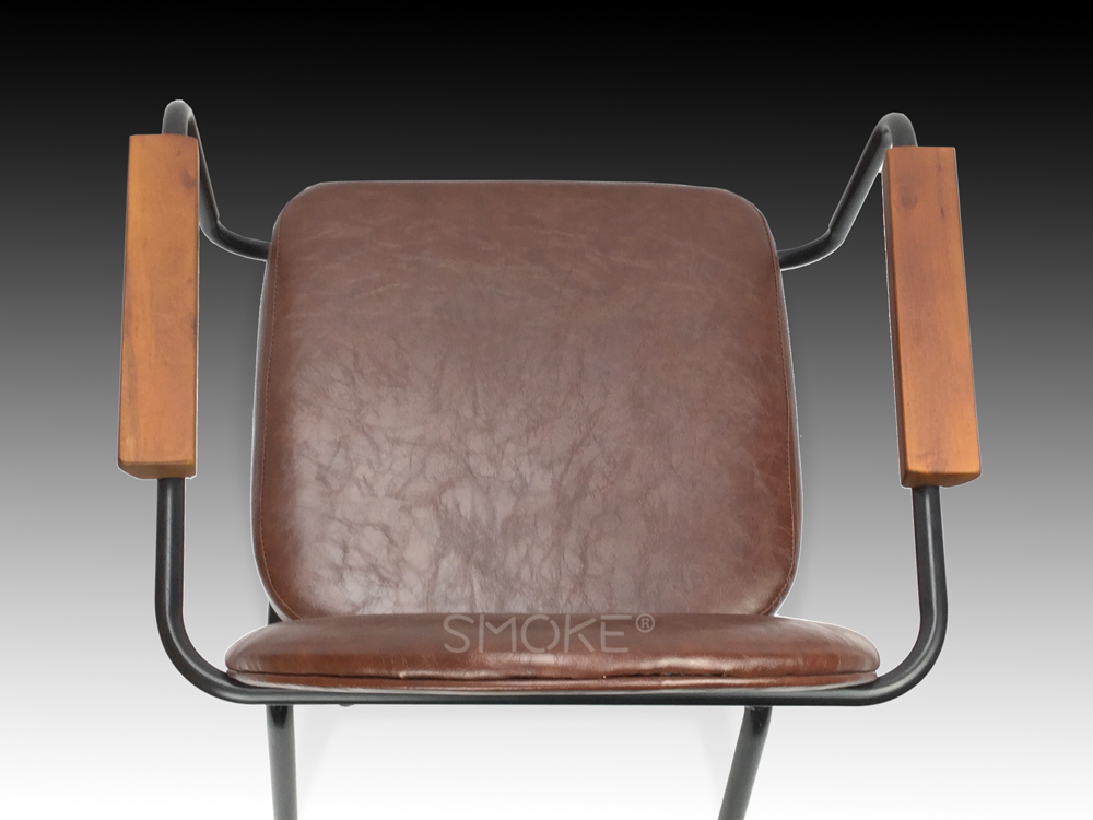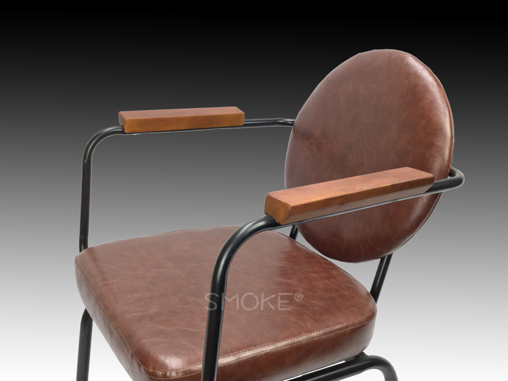 GEUMSOG Ne -stylishly simple, this iconic round - back armchair evokes classic retro understated form and function. The powder coated metallic black finish , with bespoke wooden armrest elevates the vintage vibe and adds an Industrial Loft accent. An inviting, neutral faux leather cushion offers style and decoration reminiscing the mid-century .