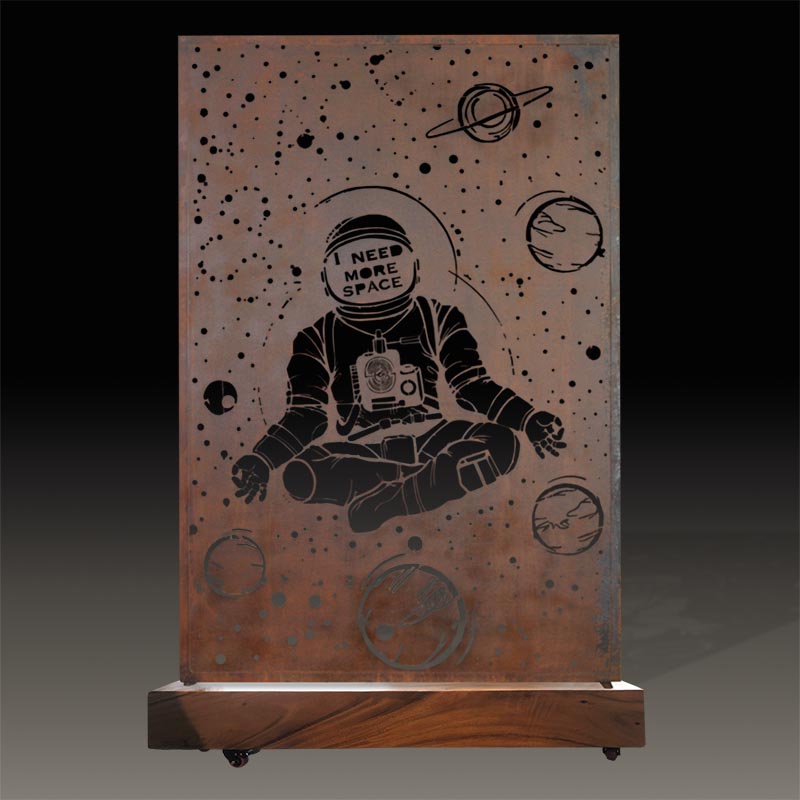 These multifunctional art metal signage can be customized as dividers , window shade , company’s stand alone statement signage. It can be mounted on windows, walls or placed on ground supported by a full customized solid wooden log or specially cast concrete beam or a metal customized welded industrial metal frame.