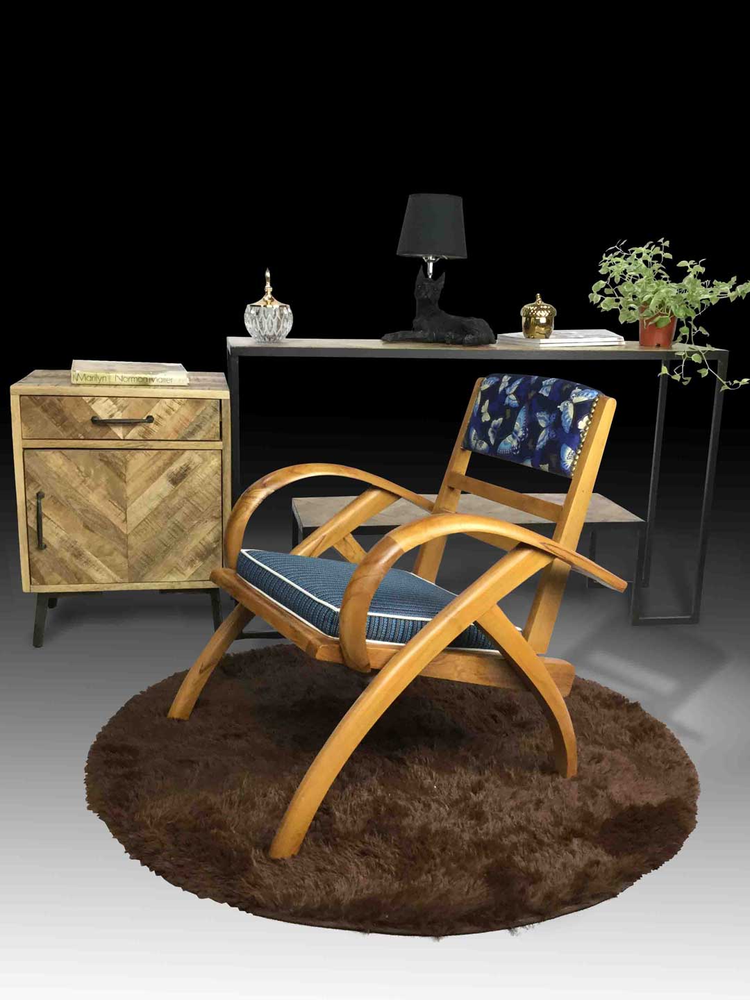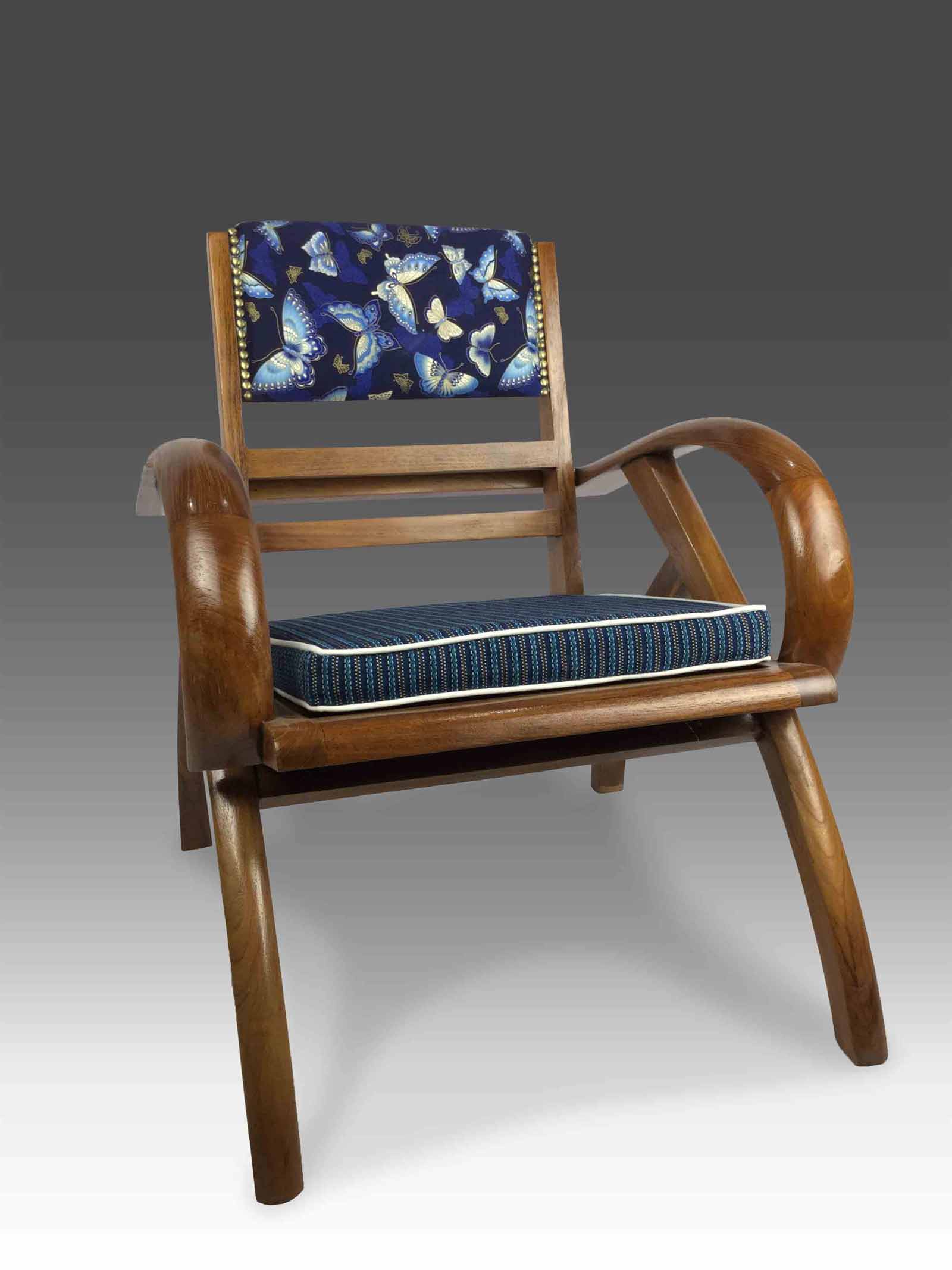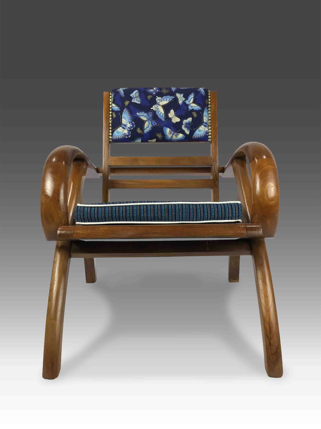 Built with solid teak wood, the Adriel chair provides the perfect seat to recline and relax in after a long day, with its tilted profile and comfortable, curved armrests. The seat and backrest is lined with fabric specially designed with the 80s in mind, with the butterflies against a plush navy background for a whimsical yet classy vibe. The Adriel chair also features a foldable backrest, making it the perfect furniture piece for smaller homes and interiors.