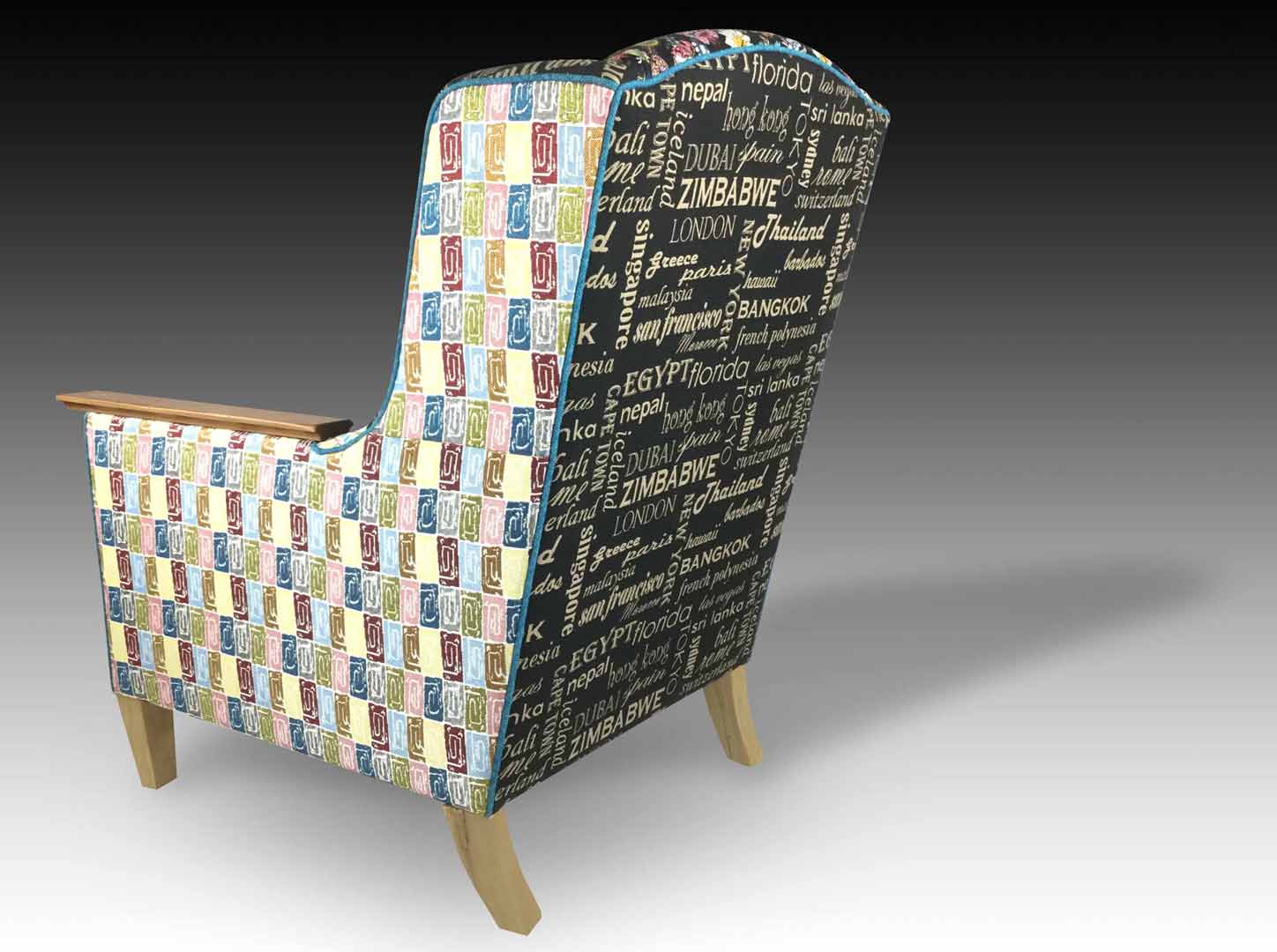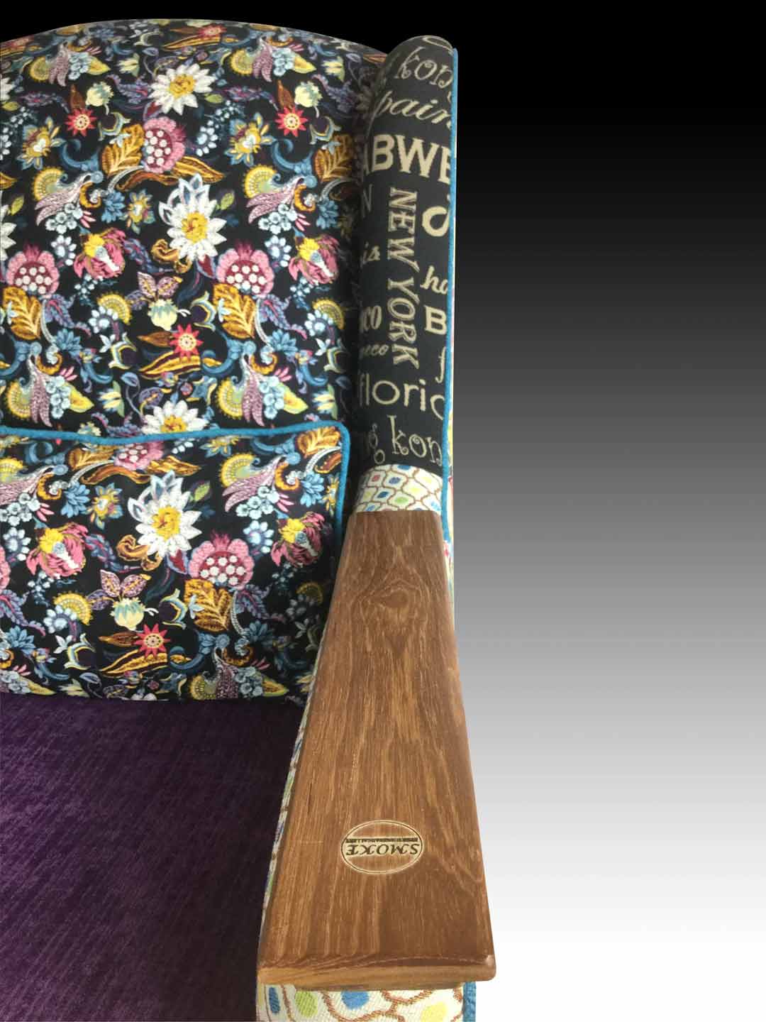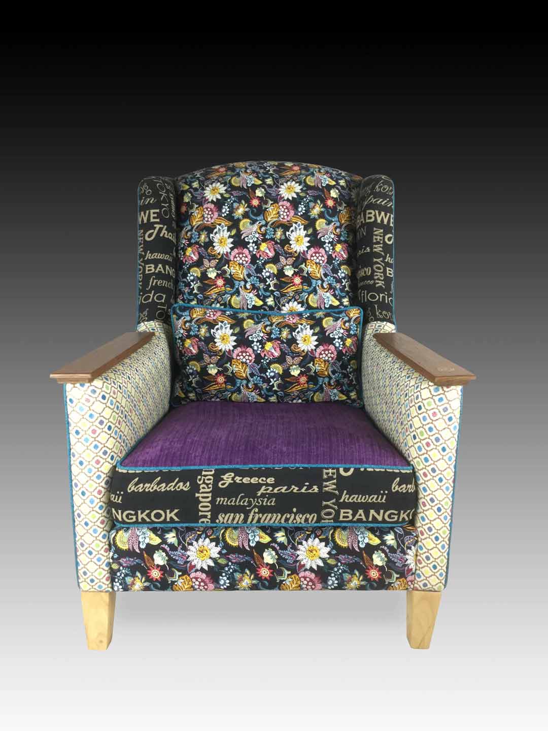 The Karin Chair is available in two colourways, each uniquely upholstered with their own blend of pattern fabric - blue and purple.