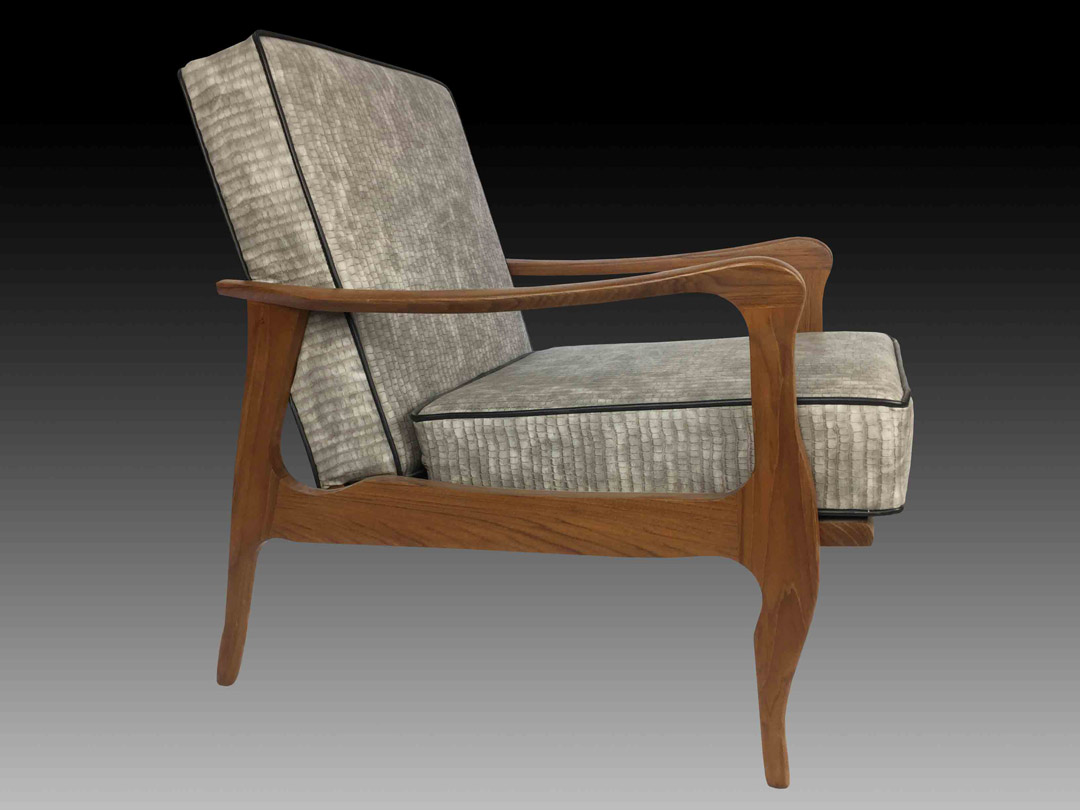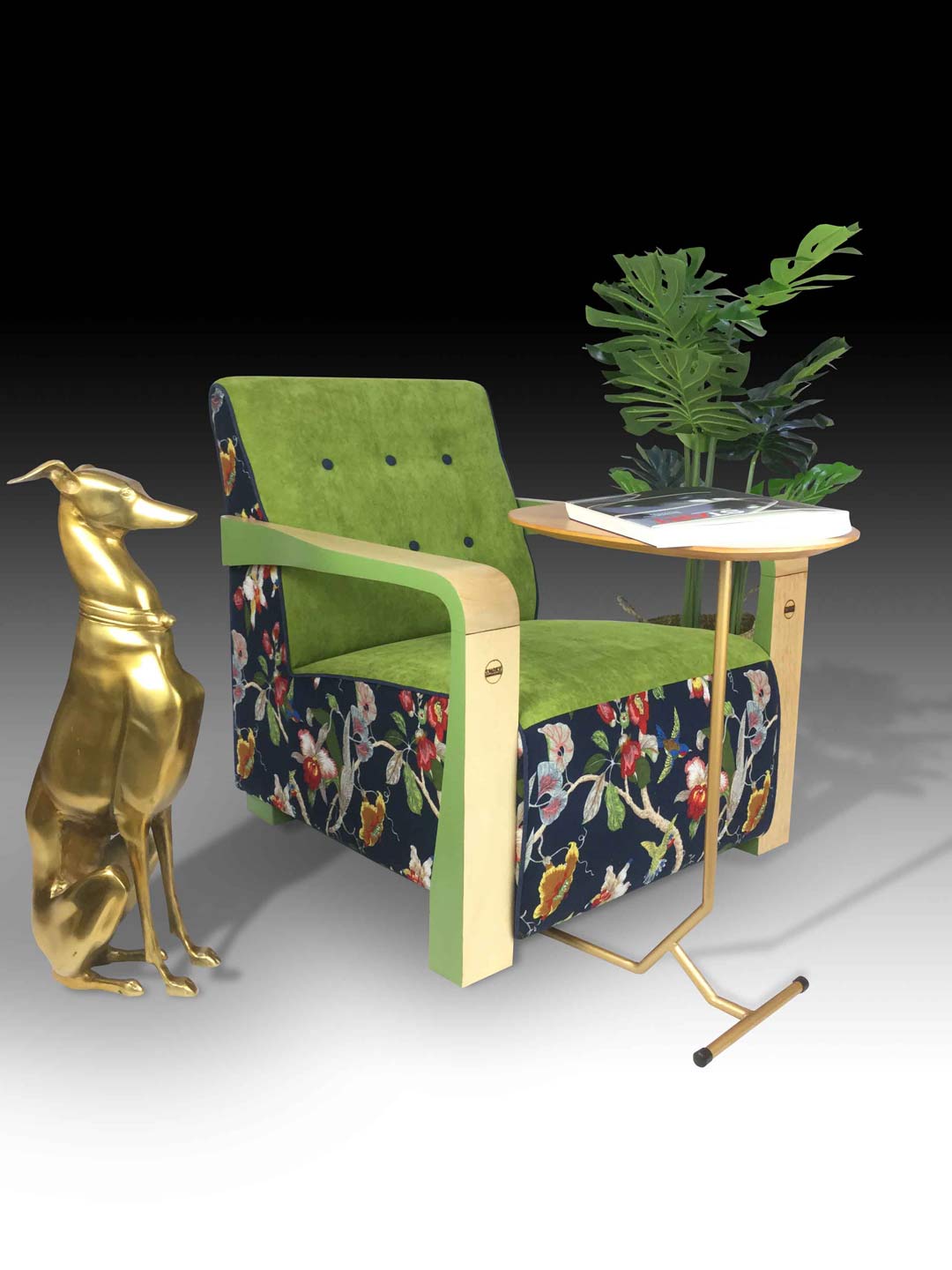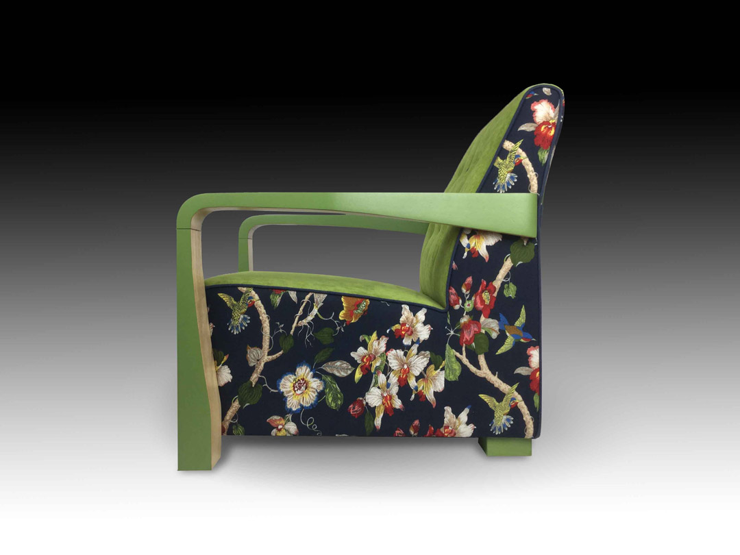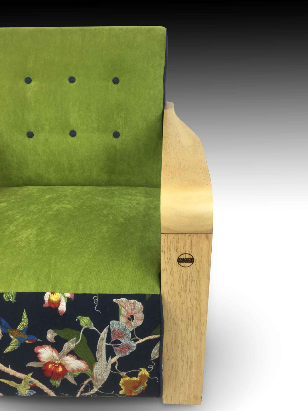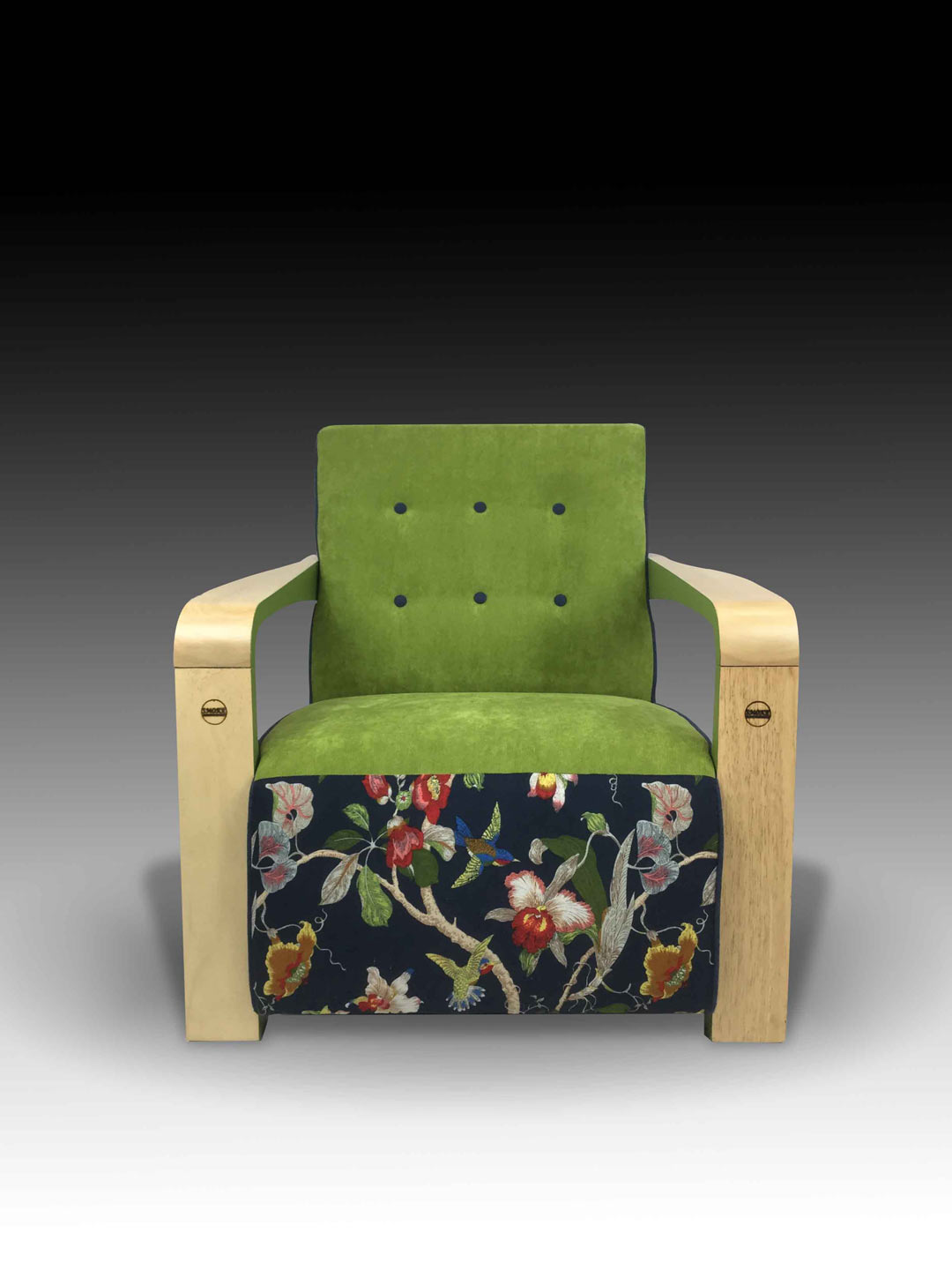 The Kriss Chair features a blocklike, chunky silhouette reminiscent of the 70s - the pine wood frame is accented with pink or green to highlight the colour of its upholstery, made with fabric specially designed to retain the lavish, bright colours and psychedelic patterns of that time period.