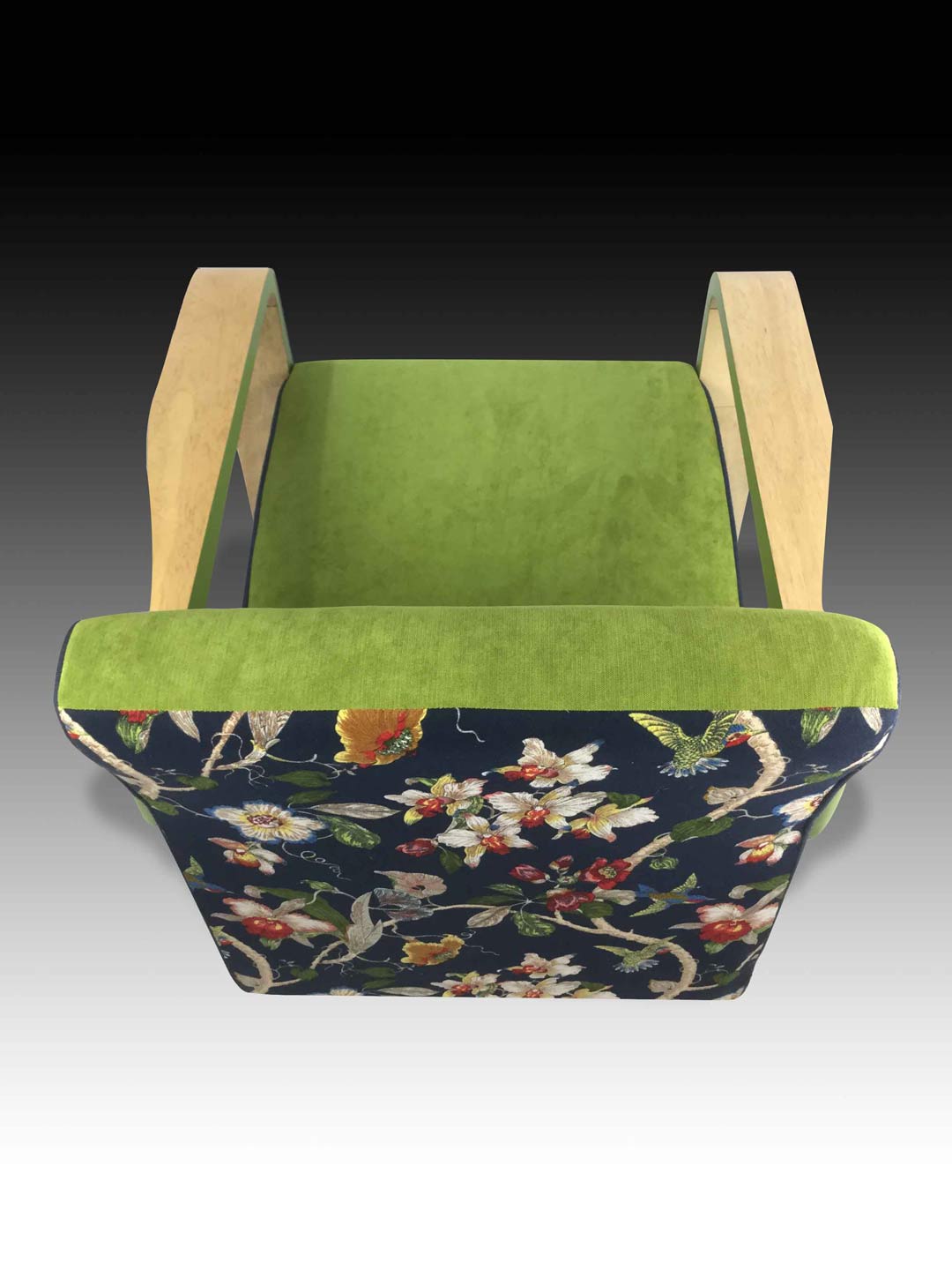 The Kriss chair comes in two colourways - pink with a fuchsia butterfly pattern for the bright and bold retro look, or green with navy florals for a more understated, muted aesthetic.