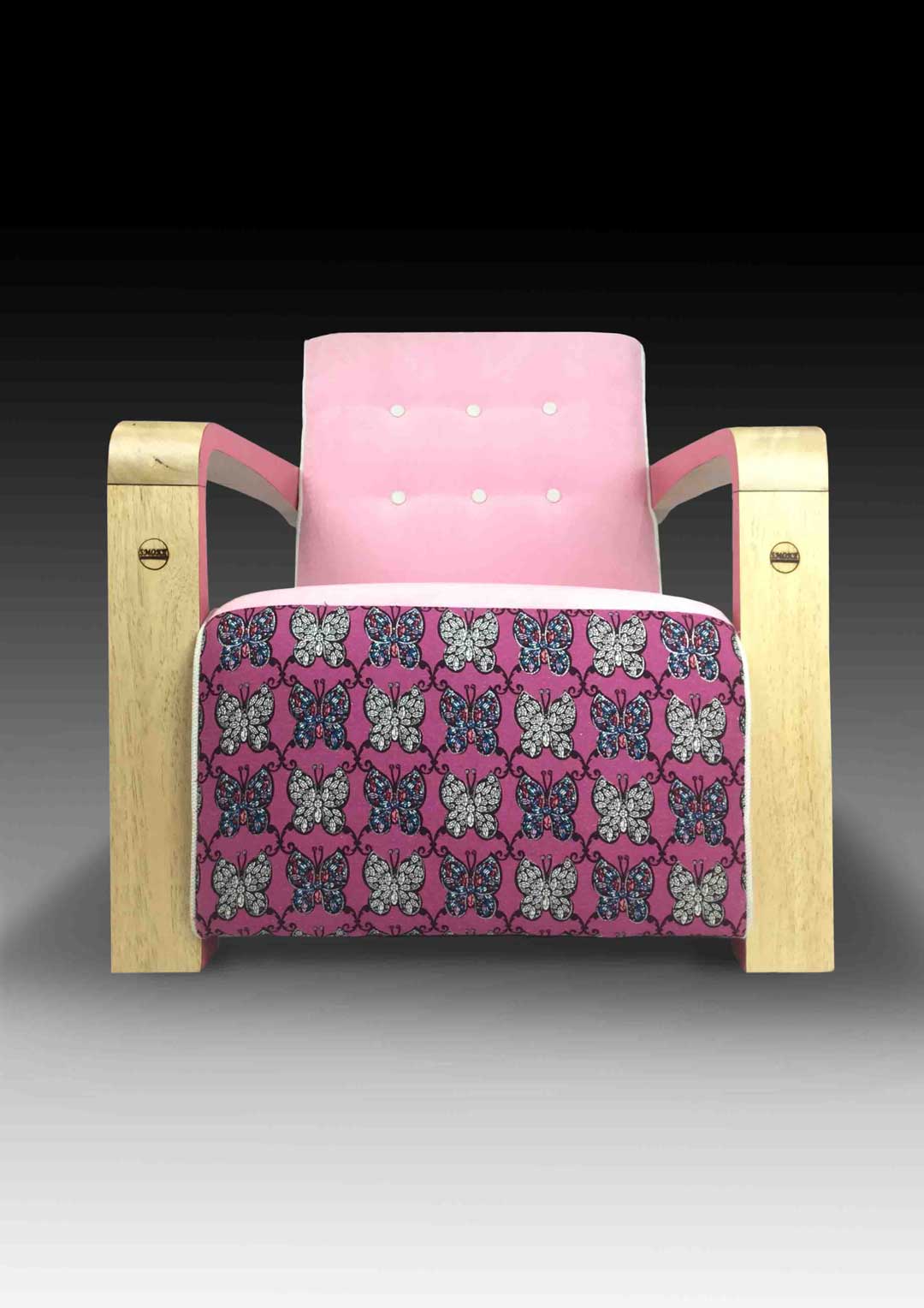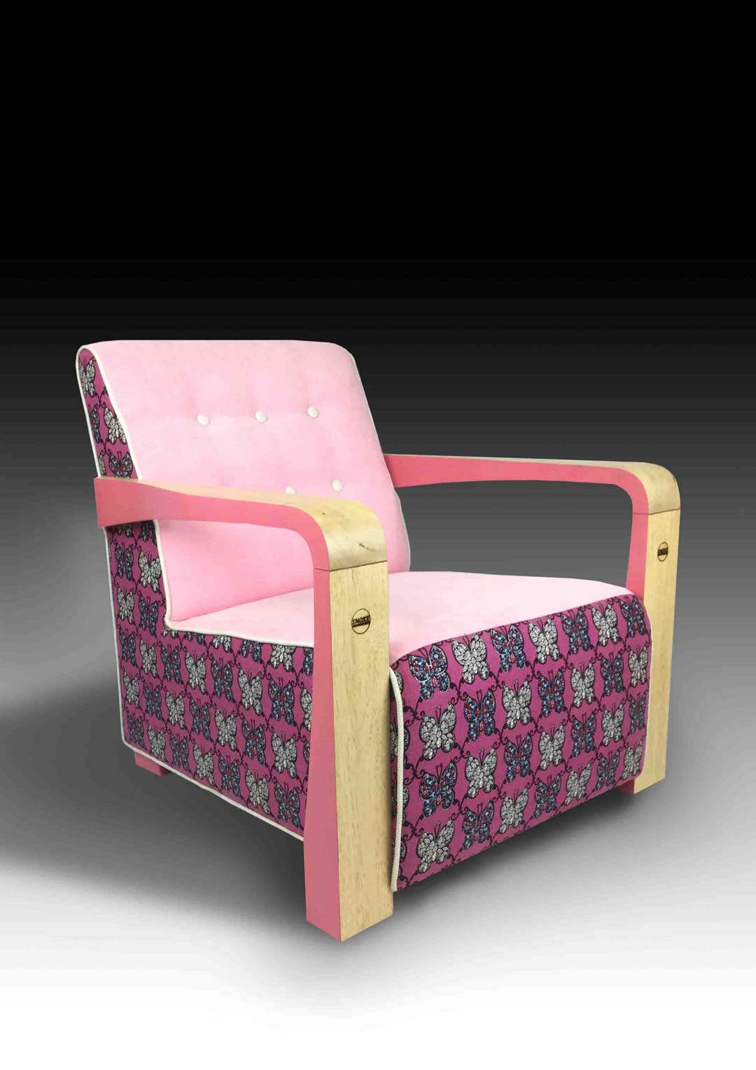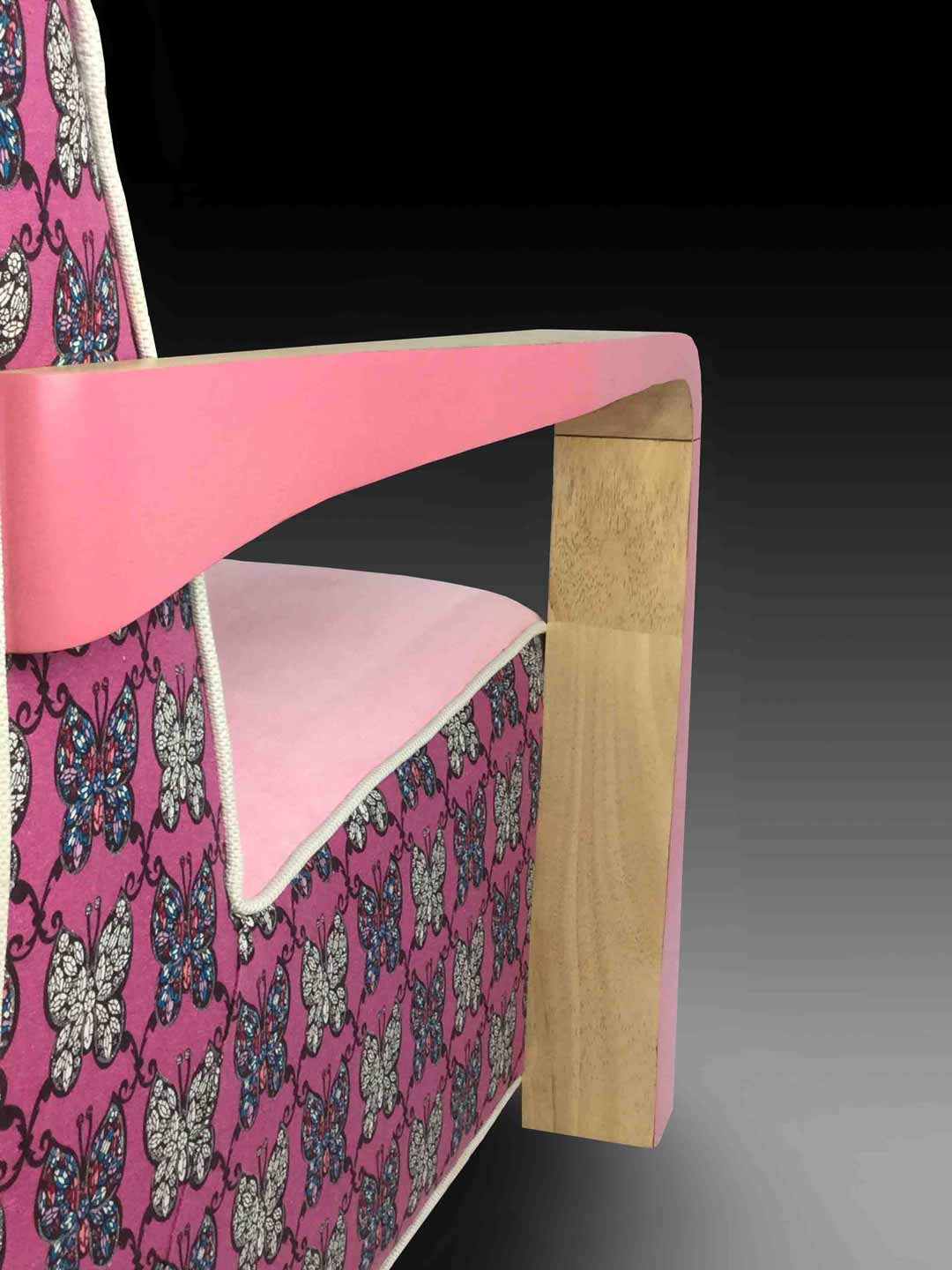 The Kriss Chair features a blocklike, chunky silhouette reminiscent of the 70s - the pine wood frame is accented with pink or green to highlight the colour of its upholstery, made with fabric specially designed to retain the lavish, bright colours and psychedelic patterns of that time period.