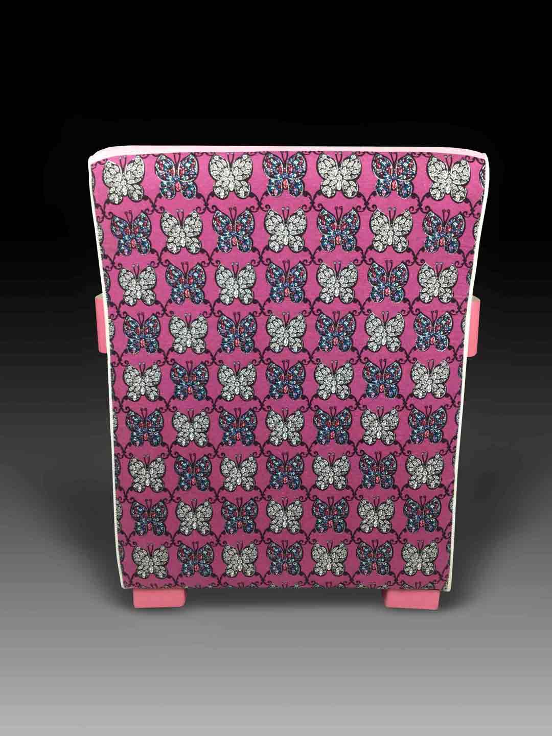 The Kriss chair comes in two colourways - pink with a fuchsia butterfly pattern for the bright and bold retro look, or green with navy florals for a more understated, muted aesthetic.