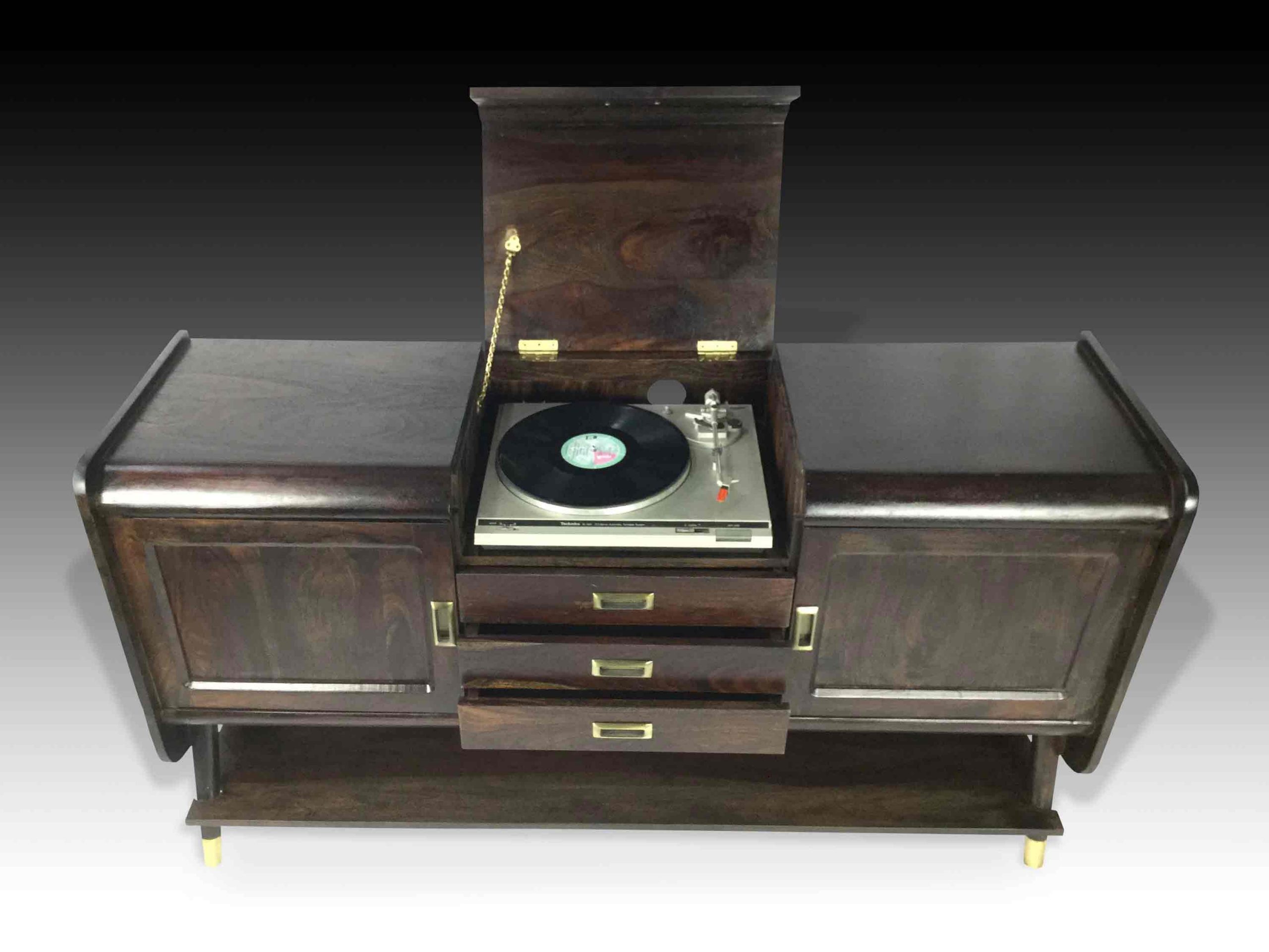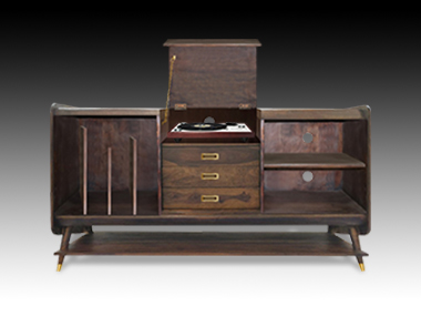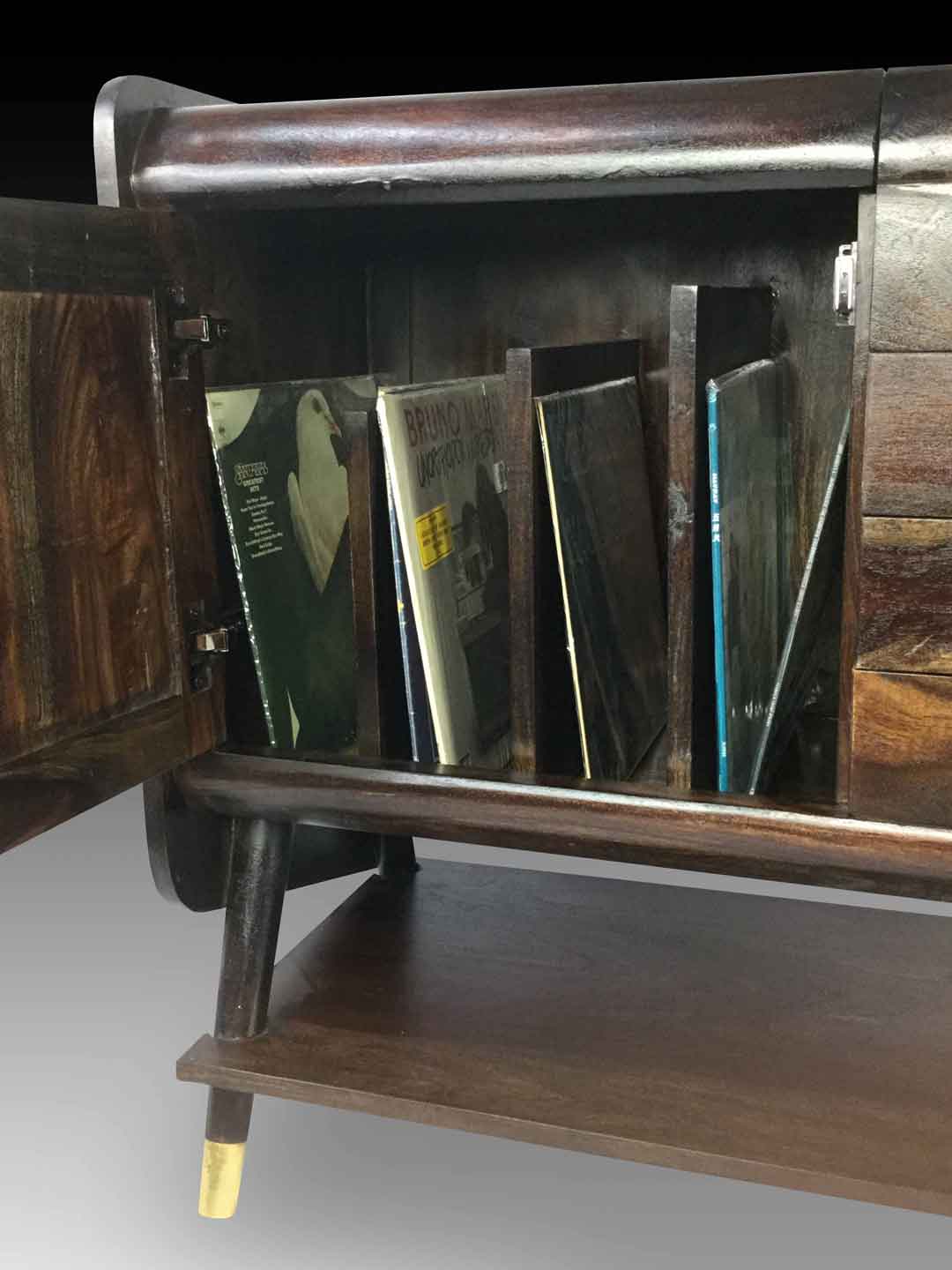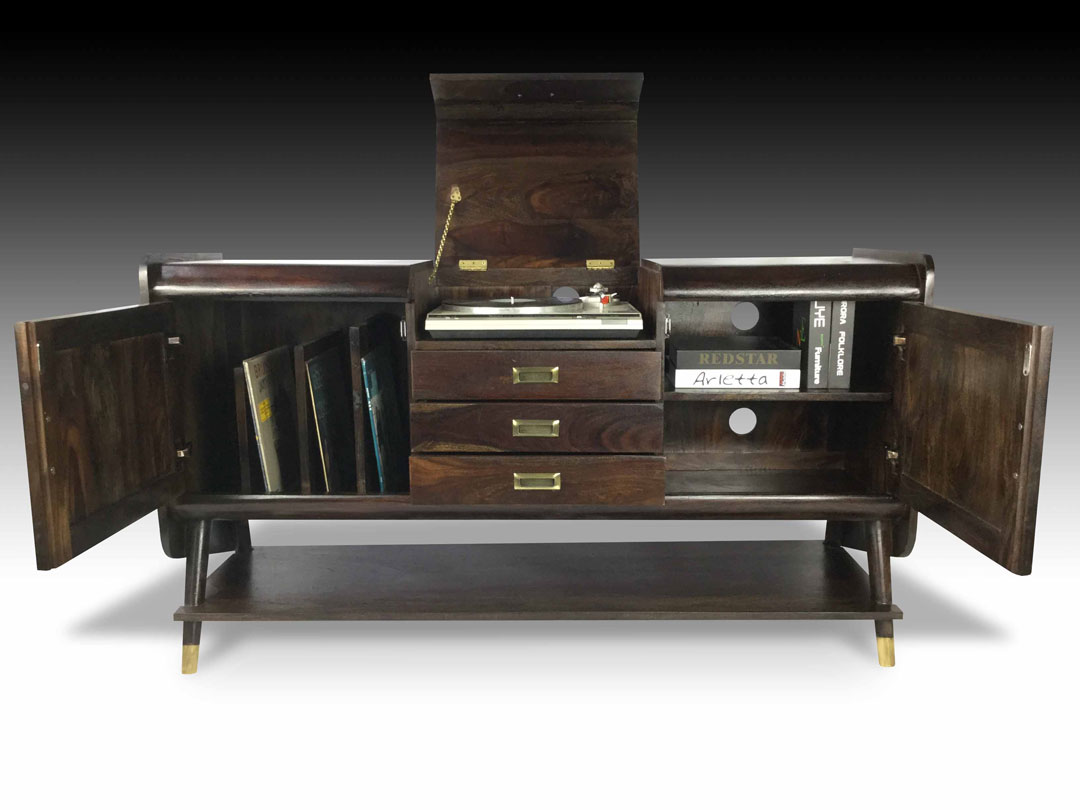 The Hera Audiophile Table is a classic. Delicately handcrafted from Acacia wood, this bespoke table is carefully treated to retain the beautiful natural grain patterns and texture of the raw material. With streamline and sleek pencil legs with metal brass capping, this exquisite piece will not fail to enamour you and your guests. The multiple compartments serve as a perfect way to store your vinyl player and records. Audiophiles are serious exquisite music enthusiasts who don’t hesitate to spend a fortune on their equipment and vintage vinyl records. With modern music and players in the new era, finding authentic audiophile tables can be very rare. If you are a music lover, invest in and entertain your guests with a nostalgic evening of soulful music with your vintage vinyl players displayed upon our audiophile table. Complete your audiophile table with the antique vinyl player, amplifier and speakers.