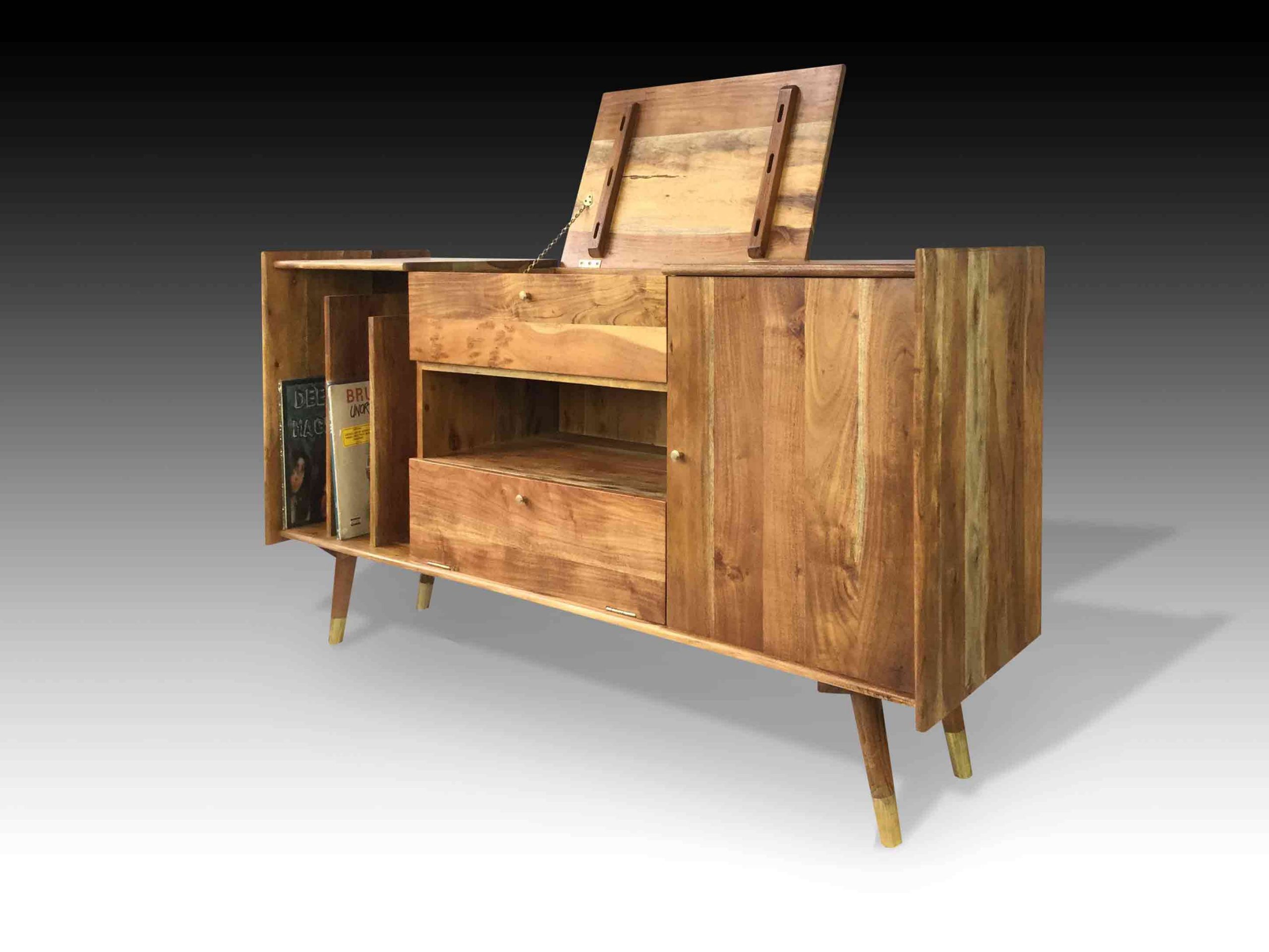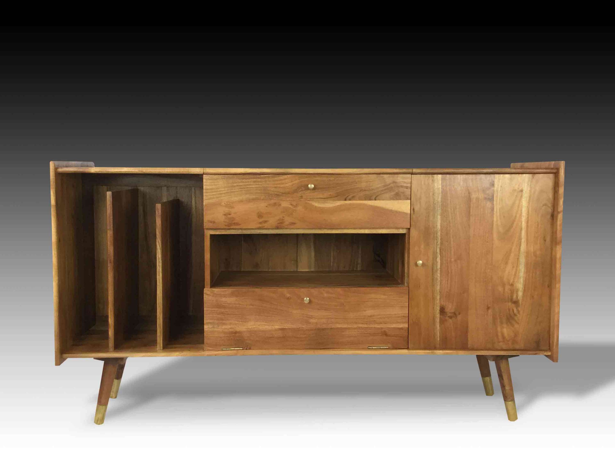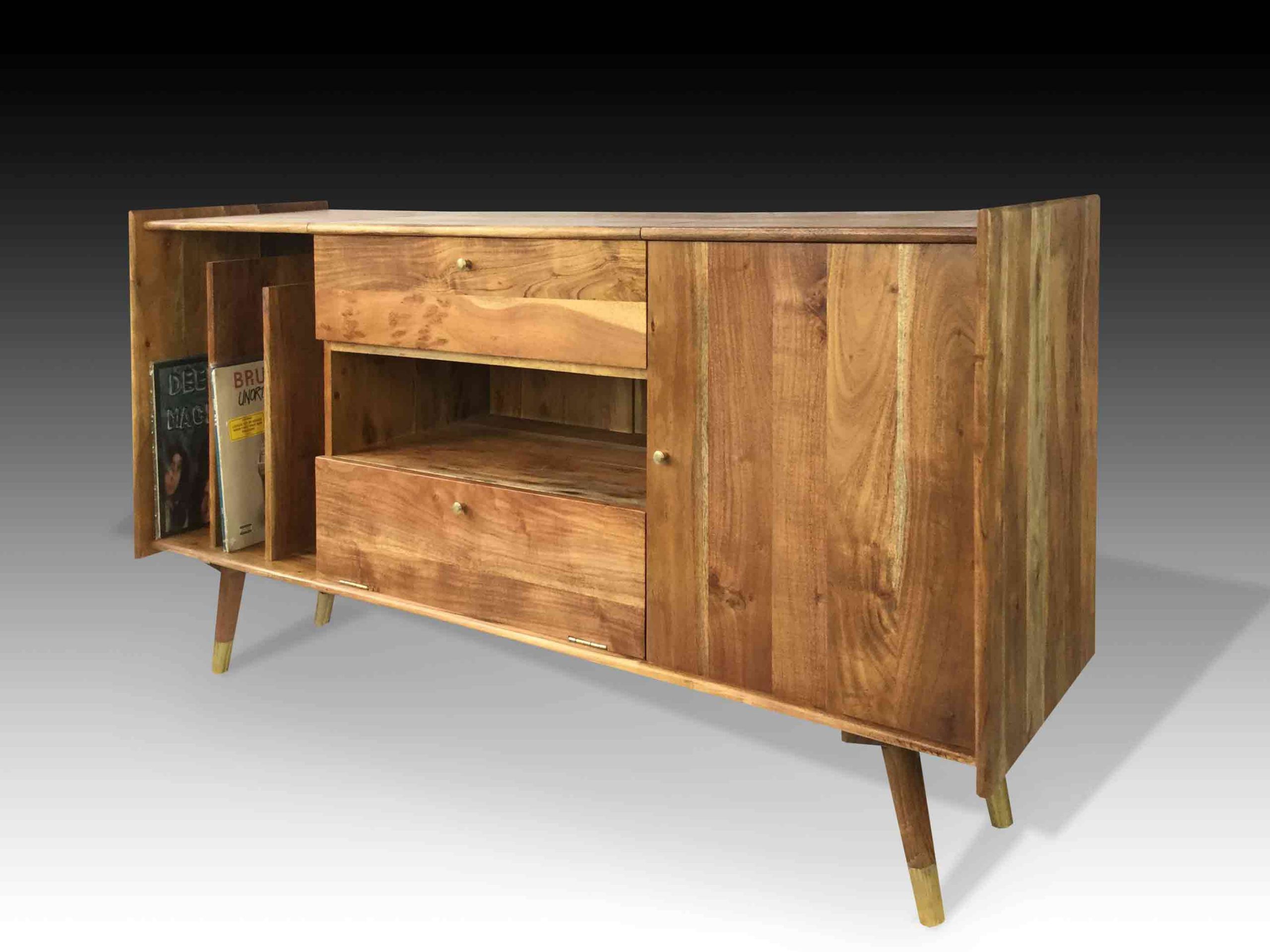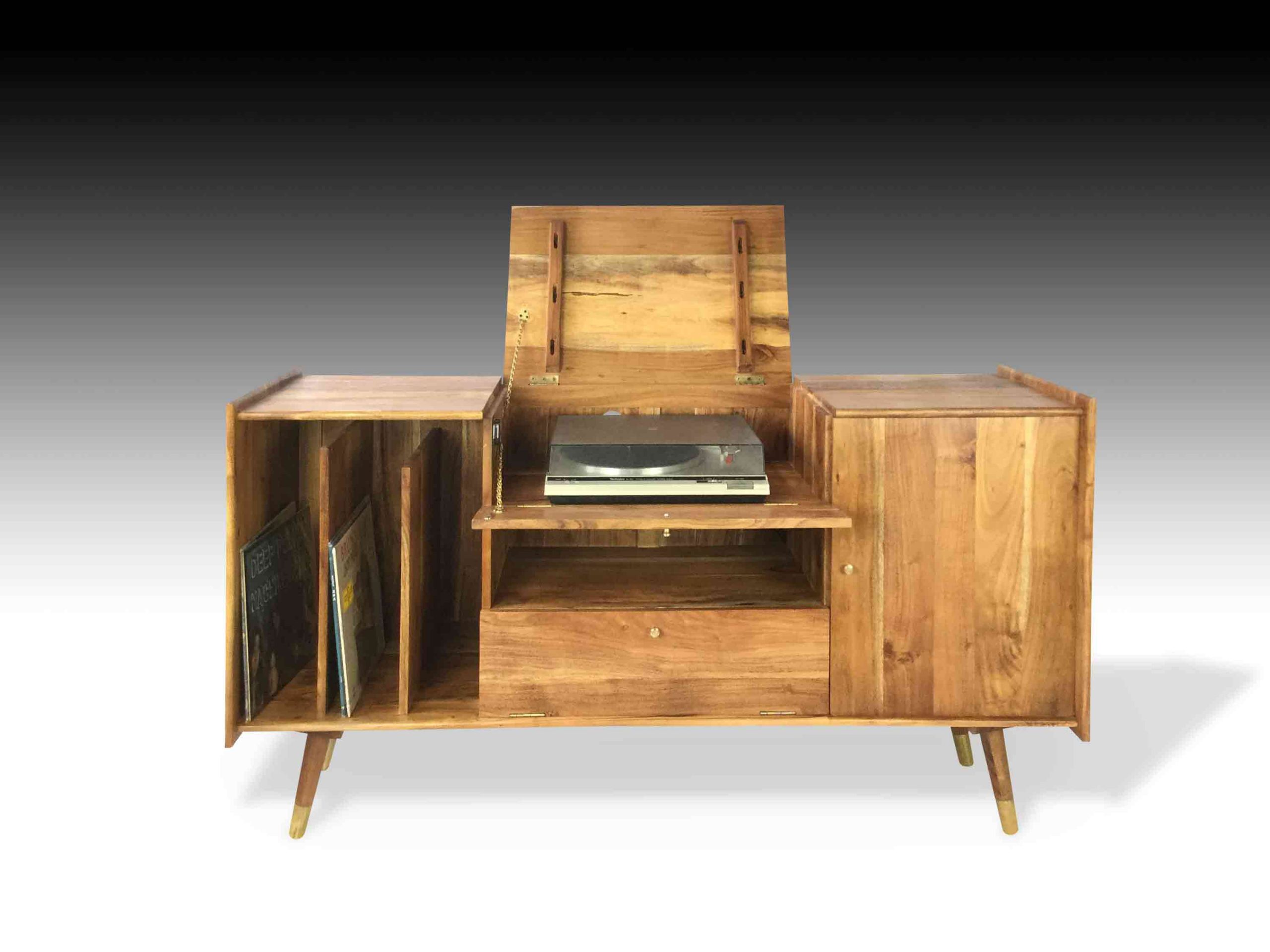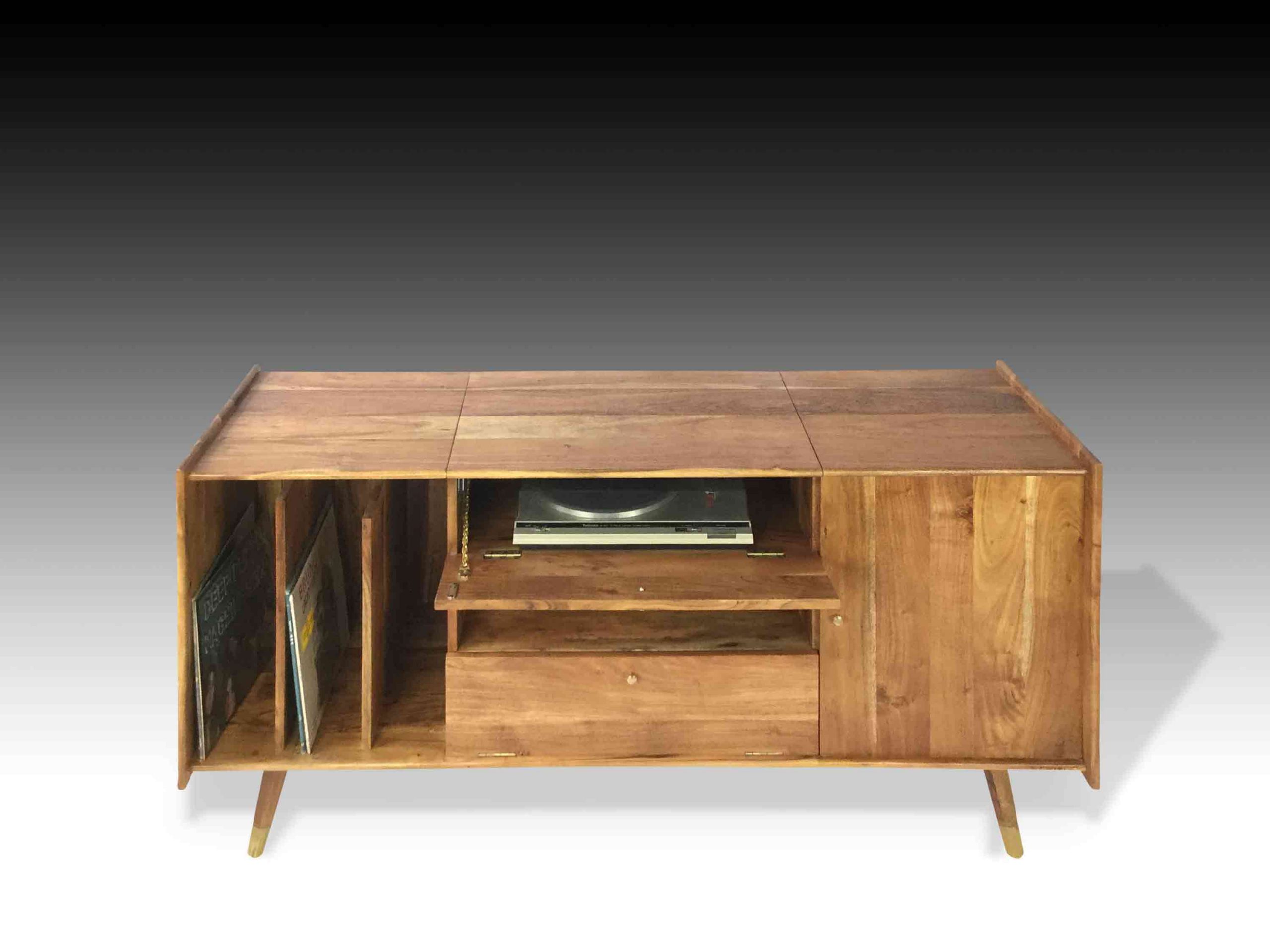 The Jaan Audiophile Table is simplistic and elegant. Delicately handcrafted from Acacia wood, this audiophile table exudes character and richness. The hardwood is carefully treated to accentuate the exquisite grain patterns and texture of the raw material. The streamline and sleek pencil legs with metal brass capping complement the beautiful tone of the wood. This minimalistic industrial table is truly a must-have for music and vintage lovers. Serious and exquisite music enthusiasts do not hesitate to spend a fortune on their antiques, equipment and vintage vinyl records. With modern music and players in the new era, finding authentic audiophile tables can be really rare. With the best audiophile tables in the market, our retro styled tables will not cease to evoke nostalgia from the vinyl era. Adorn your homes with this vintage yet modern audiophile table. Complete your audiophile table with the antique vinyl player, amplifier and speakers.