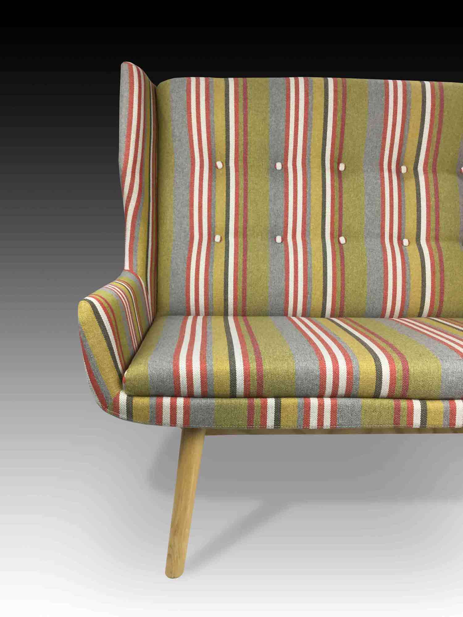 The Neukkim Sofa is a retro-style double seater sofa perfect for curling up with your loved one after a long day. Using the 70s-inspired wing sofa silhouette with an ash wood frame and iconic pencil legs, the Neukkim Sofa is upholstered with our specially designed retro-inspired fabric with muted greens, grey tones and lush, deep reds to recreate the full retro vibe. The fabric upholstery of the Neukkim Sofa is designed with little button details for the maximum retro aesthetic, and comes with two throw cushions for extra cuddling comfort.